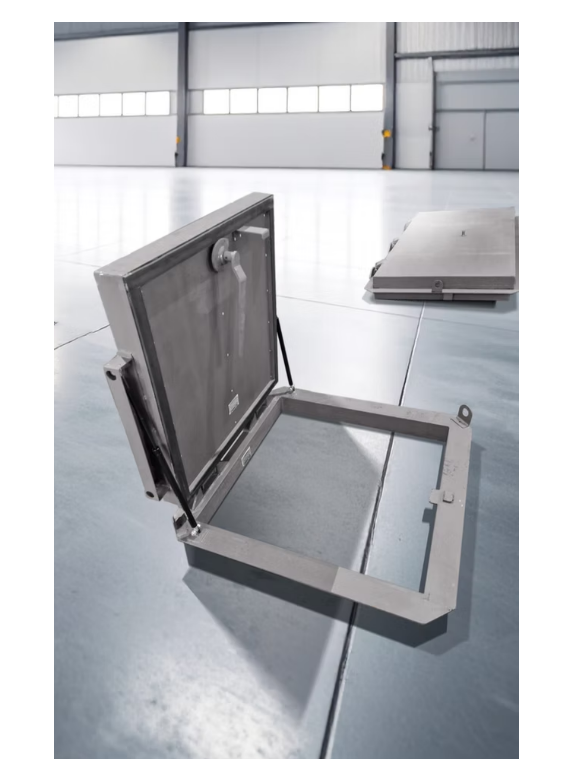 SU-type shelter hatches with gas-operated lifting mechanisms are designed to open from the top. A supporting lifting mechanism can be added to the SU-IVR, SU-III, and SU-I models to allow for horizontal installation and top-opening operation. The hatch flange is constructed from beams reinforced with cladding plates. The hatches can be upgraded with armor plates for shrapnel/ballistic protection and special materials for fire resistance.SU-type hatch covers feature a multi-point locking system with a gear or lever mechanism, equipped with a rubber gasket for gas tightness, providing better protection against blast wave pressure.